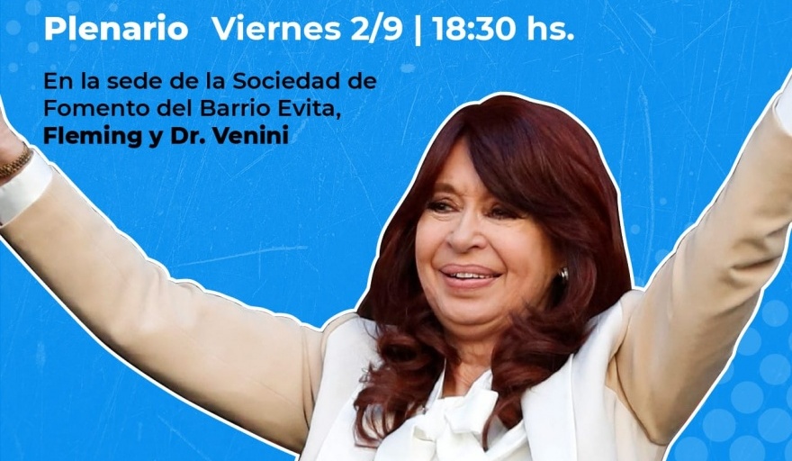El Frente de Todos Junín realizará este viernes el Plenario “Todos con Cristina”. La jornada en apoyo a la vicepresidenta de la Nación, Cristina Fernández de Kirchner, comenzará a las 18:30 y se desarrollará en la sede de la Sociedad de Fomento del Barrio Evita, Fleming y Dr. Venini.