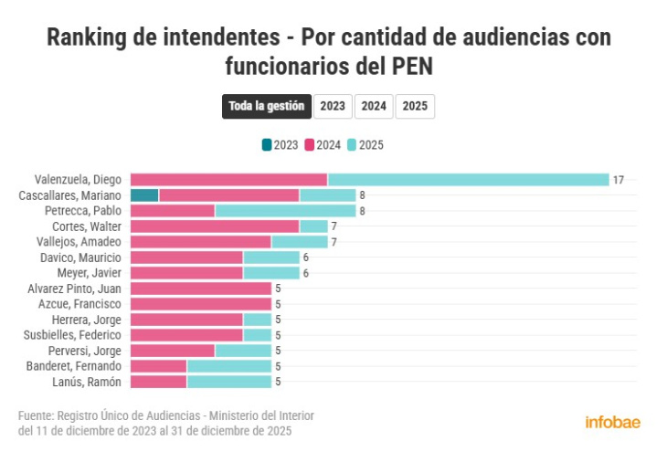 El ranking refleja el nivel de articulación política e institucional entre los gobiernos locales y la administración nacional, especialmente en un escenario de restricciones presupuestarias y redefinición del rol del Estado. En ese marco, las audiencias suelen estar vinculadas a gestiones por obras, programas y financiamiento para los distritos.