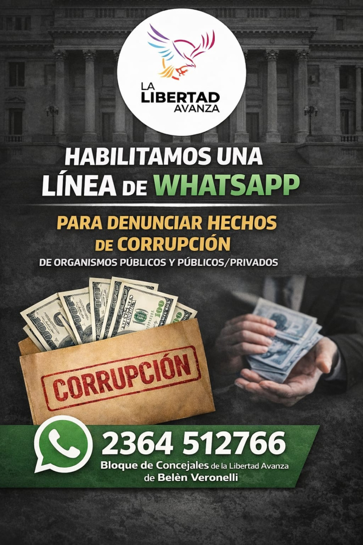 Desde el bloque de La Libertad Avanza en el Concejo Deliberante de Junín anunciaron la puesta en funcionamiento de una línea de WhatsApp destinada a recibir denuncias sobre presuntos hechos de corrupción vinculados a organismos e instituciones públicas o público-privadas.